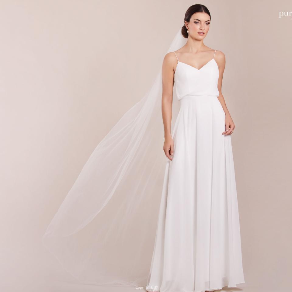 Bröllopsklänning i den vackraste satäng med smala axelremmar och en fin A-linjekjol med släp. Midjestycket markerar figuren och klänningen stängs på baksidan med fina satängknappar.