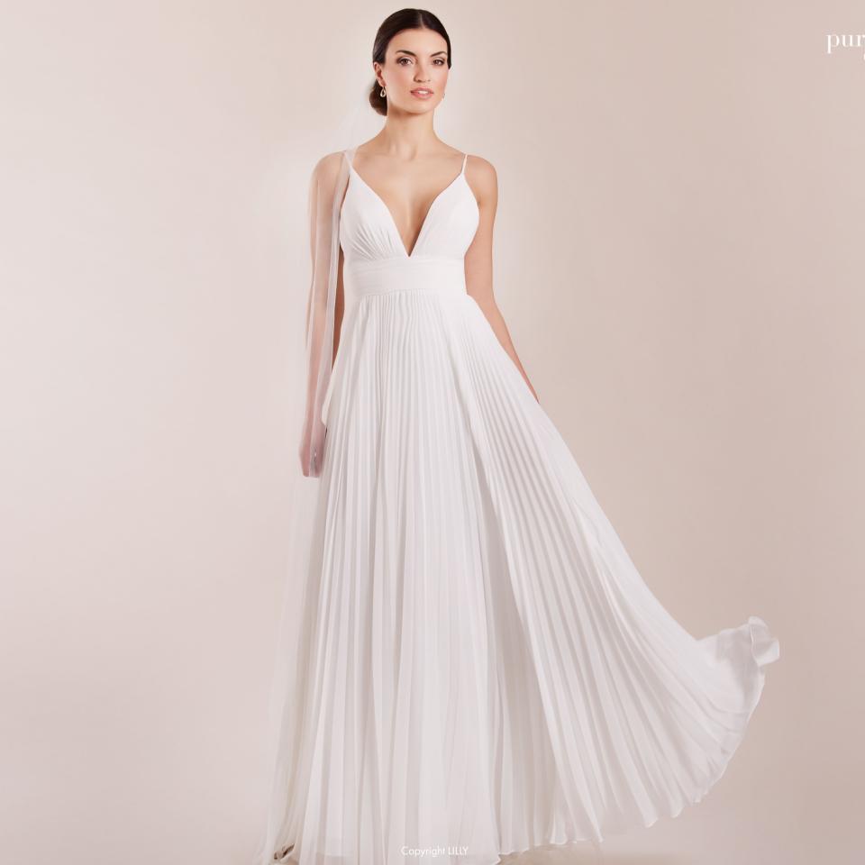 Lätt och fin bröllopsklänning i mjukt georgette tyg med pärlbroderad hals.