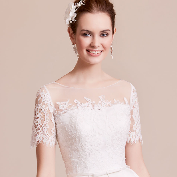 Om du har valt bröllopsklänning utan axelband, men vill täcka dina armar eller rygg, är filigran-spets det perfekta valet. Remmar med spets, illusionsskärningar och vackra ryggar kommer garanterat att dra blickarna till sig.