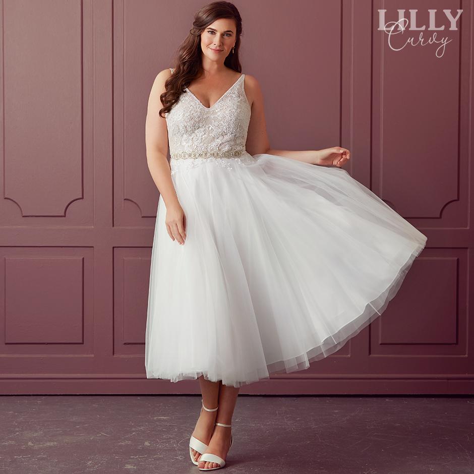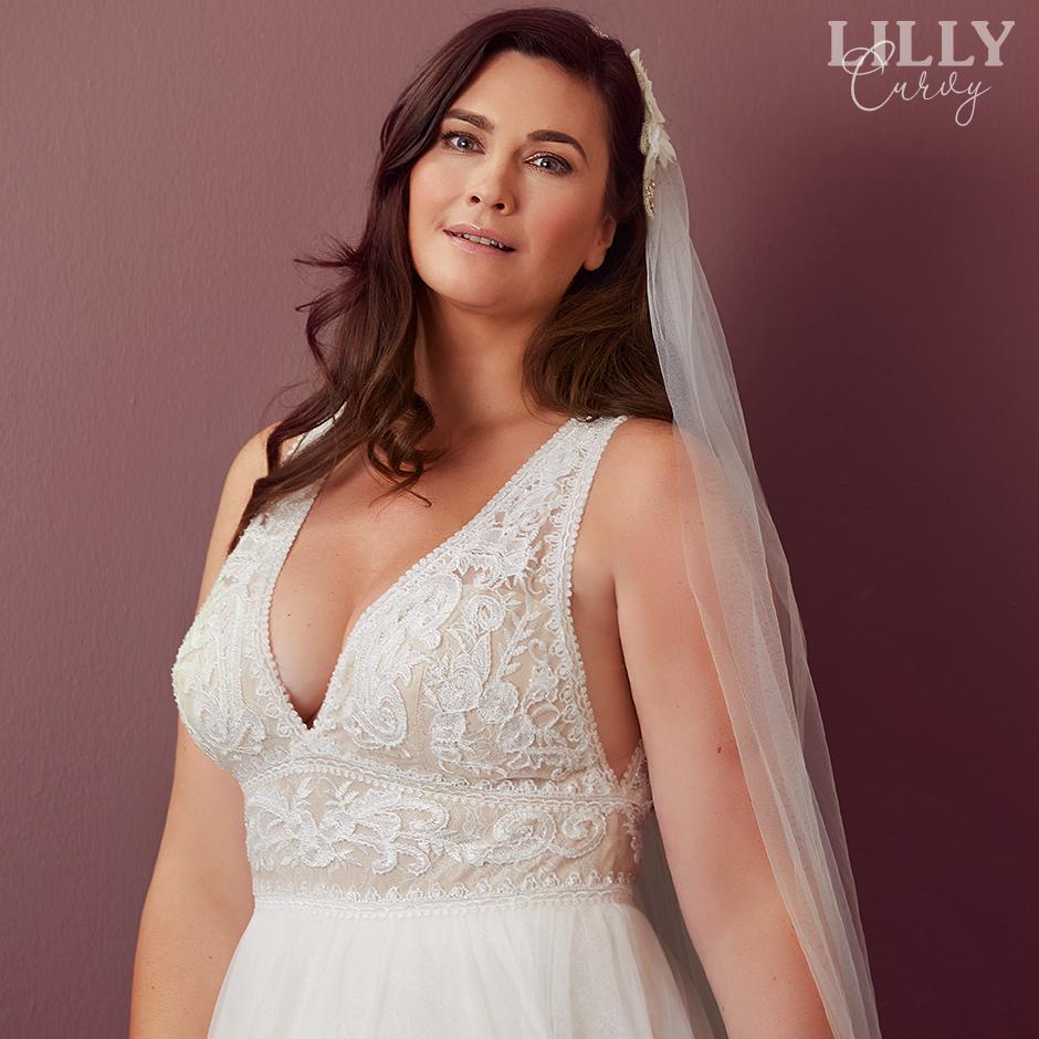 Hos LILLY har vi ett stort utbud av storlekar i butiken. Och om din drömklänning inte finns i rätt storlek kan du få den speciellt uppsydd upp till storlek 52/54 – utan extra kostnad och på bara 16 veckor *.