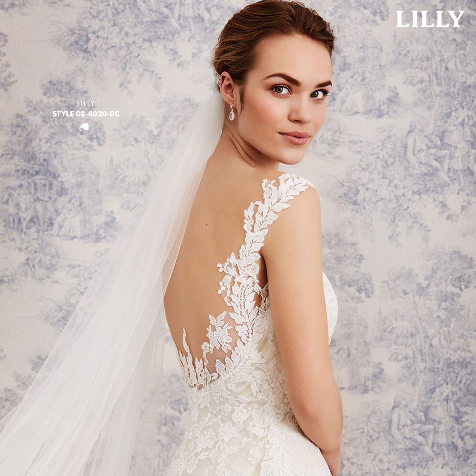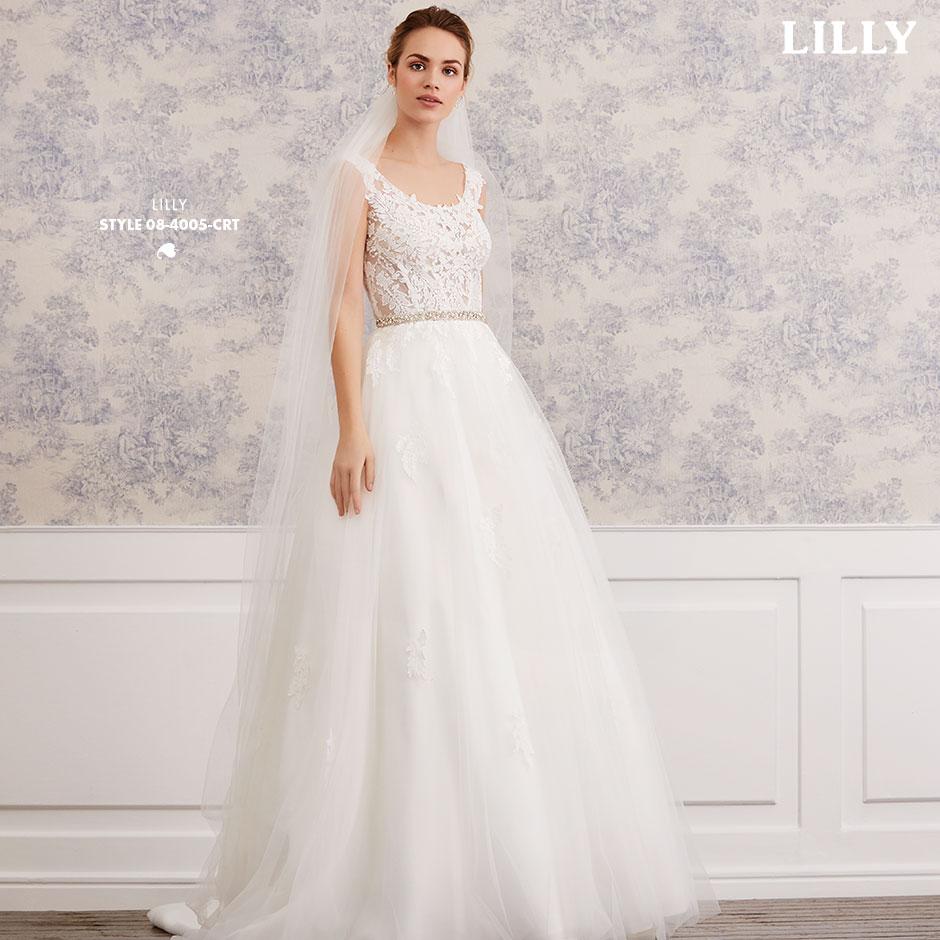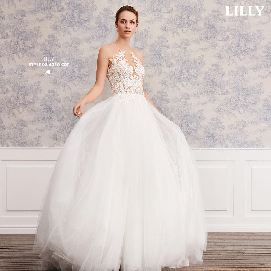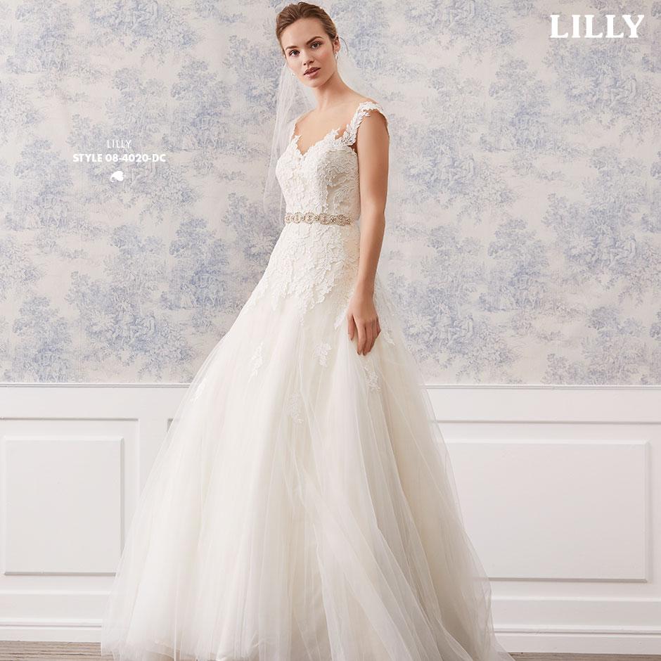 Den här klänningen kombinerar en klassisk prinsess-look med en touch av sofistikerad sexighet! Den grafiska spetsen täcker vackert klänningens överdel och accentuerar brudens bara axlar.