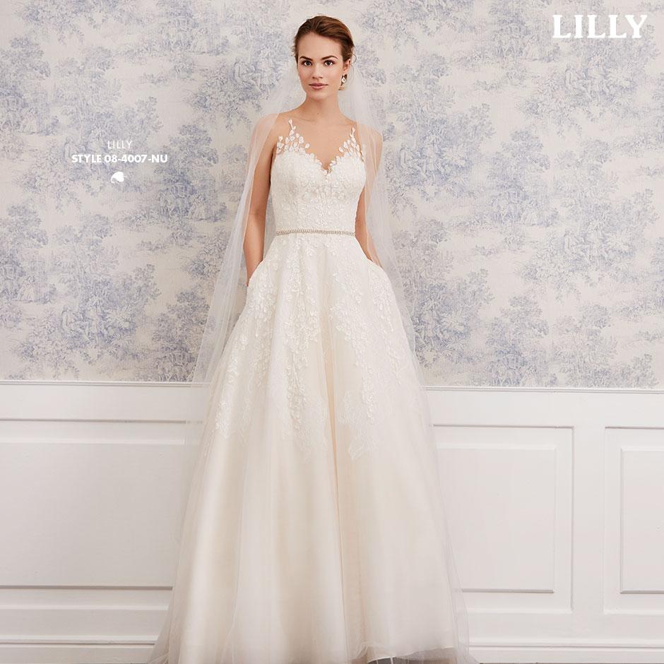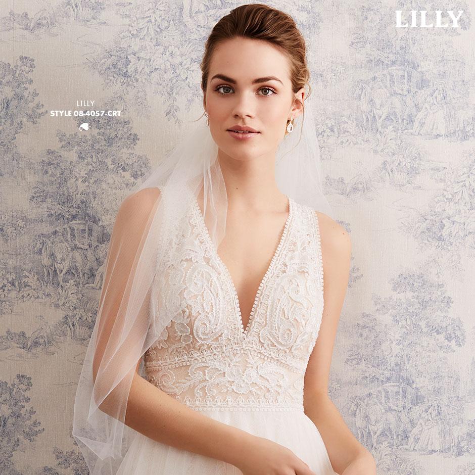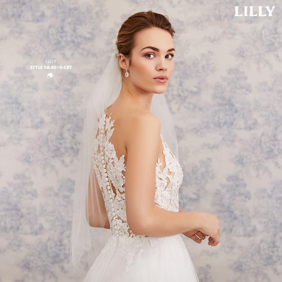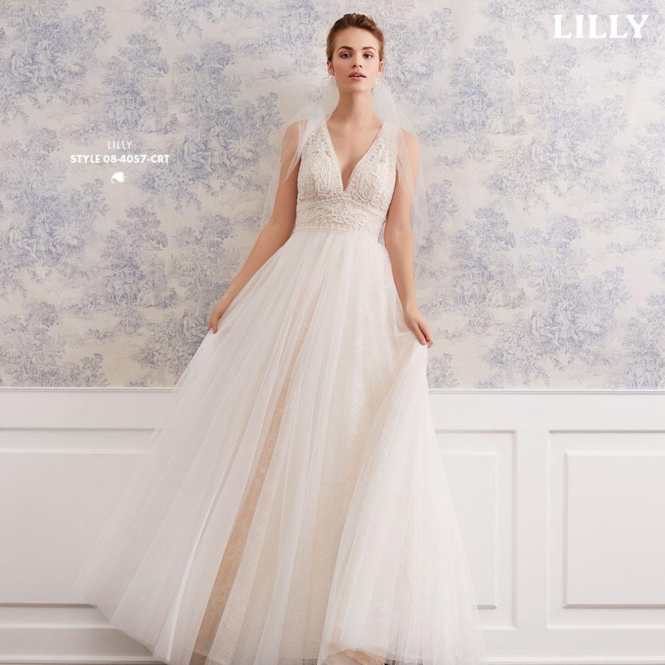 Det djupa V-snittet betonar bysten och klänningens mittparti markerar midjan på ett utsökt sätt. All spets, och nederdelens många lager av tyll och semidold spets, framhävs diskret tack vare klänningens foder i vintage-färgad satin.